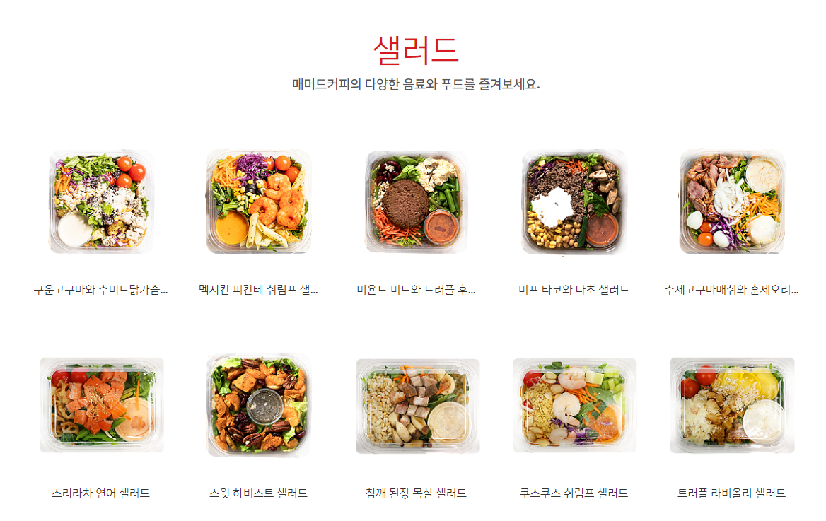 홈페이지에서 찾아보니 샐러드 메뉴가 너무 다양하고 맛있어 보여서요. ^^ 참깨 된장 목살 샐러드는 카페에서 만나면 너무 반가운 것 같은 메뉴고(카페+목살이라니..), 다른 것들도 식사대용으로 좋을 것 같아요.