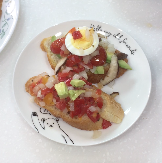 위에 작은 접시에 토마토 부르스케타와 버섯 타파스 하나씩만 얹었지만 한 8개 정도 만들었거든요. 두가지 측면에서 좀 현타가 오더라구요. 빵집에서 너무 크게 잘라놓은 바게뜨를 샀다는 생각. 이것 밖에 없었지만 귀엽게 핑거푸드느낌으로 하고 싶었는데 이건 좀 아닌 것 같다는 생각이 들었어요. 그리고 시간이 너무 많이 걸렸답니다. 체감상 2시간은 걸린 듯해요. 무슨 식전 빵을 2시간이나 걸려서 만드냐는 자괴감과 토마토는 절대 잘게 자르지 말아야지 하는 깊은 깨달음이 왔어요.^^( 마지막 사진에 아보카도 쪼가리 괜히 얹었어요. -.-)