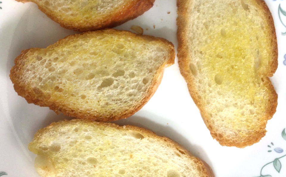 바게트빵은 올리브유를 살짝 묻혀서 구워주었습니다. 겉만 살짝 구워요. 바삭한 것이 취향이시면 좀 더 오래 구워도 좋구요. 저는 프라이팬에서 살짝 구웠습니다. 이제 재료준비는 모두 되었구요. 토핑을 올려주기만 하면 됩니다.