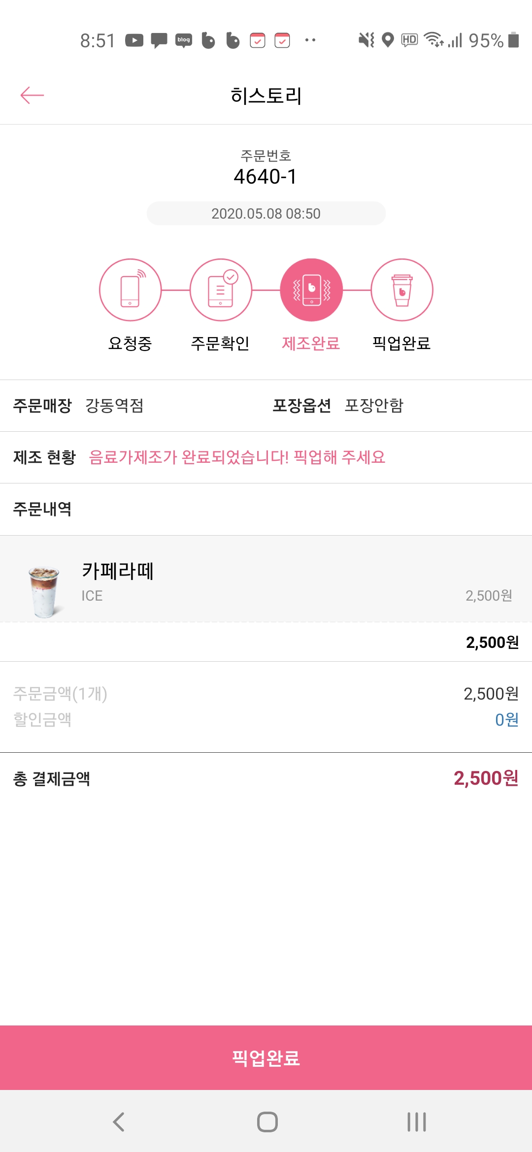 어플에서 주문하면 주문이 접수되고, 제조가 시작되고, 제조가 완료돼, 픽업을 요청하는 단계가 모두 알림으로 떠요.