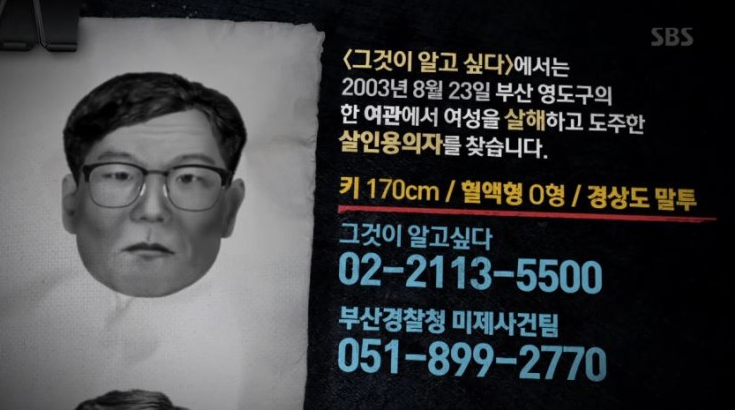 2003년 부산 영도 초원장 여관에서 살인사건이 발생합니다. 피해자는 성매매 여성 이주희씨. 신고를 받고 출동한 경찰은 방 입구에서 칼과 속옷 상하의, 안경과 시계가 발견됩니다. 현재는 문을 닫은 초원장 주인 부부는 사건 초기, 여관에서 성매매를 한 것이 드러날까봐 거짓진술을 했던 것이 드러났는데요, 재조사 후 밝혀진 사실은 그날 30~40대로 보이는 한 남자가 찾아와 성매매알선을 요구한 후 값을 지불하고 306호로 올라가자, 손님의 요구대로 주인은 성매매알선업자에게 전화를 걸었고 10분 후 주희씨가 도착했다고 합니다. 주희씨가 나올 시간이 지났는데 안나오자 알선업자는 여관주인에게 전화를 했고, 여관주인이 306호로 올라가서 참혹한 광경을 마주합니다. 남자손님은 이미 사라진 상황. 옆방 투숙객은 '살려주세요' 하는 소리를 들었다고 합니다.