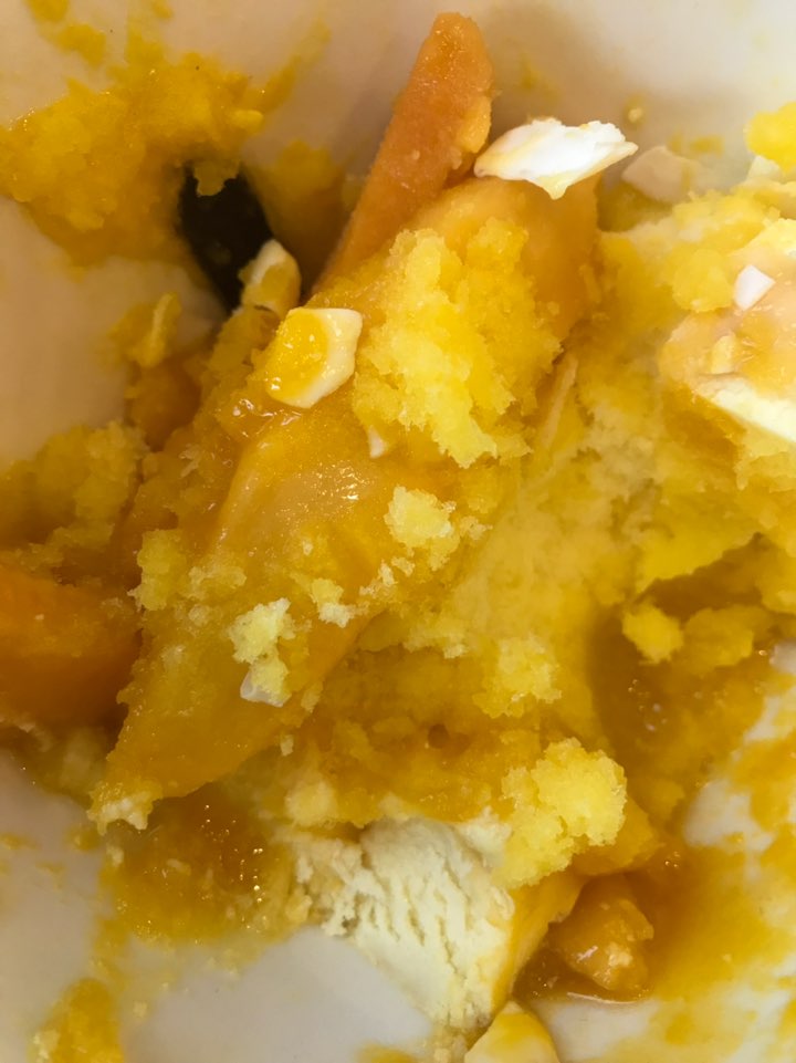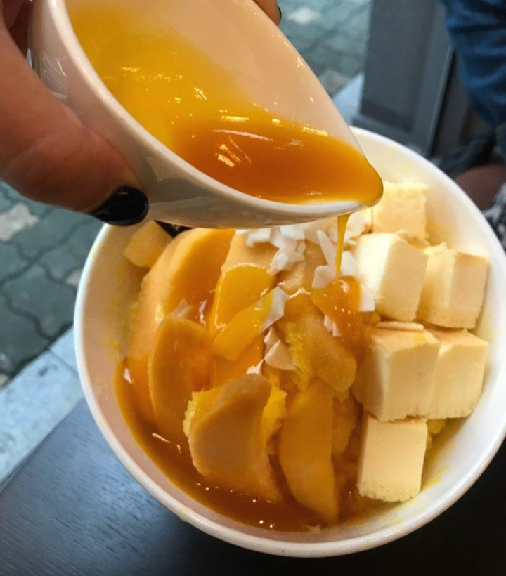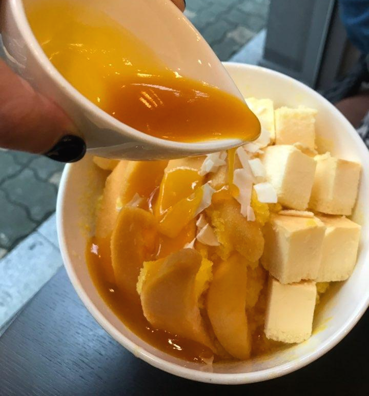 이렇게 시럽을 부어서 빙수먹방을 시작합니다. 확실히 시럽을 부으니 꽁꽁얼어 딱딱했던 망고가 부드럽게 녹기 시작해서 먹기는 더 좋은것 같았어요. (하지만 양조절은 필수!)