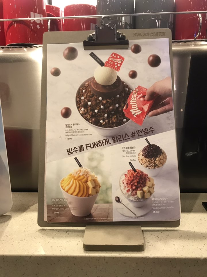 할리스커피에는 다양한 종류의 빙수가 있어서 입맛에 맞게 선택하실 수 있어요. 인절미가 더해진 팥빙수와 딸기치즈케익 빙수, 그리고 몰티져스를 더한 초코빙수 & 제가 선택한 망고치즈케익 빙수 이렇게 총 4 종류의 빙수가 준비되어 있었어요.