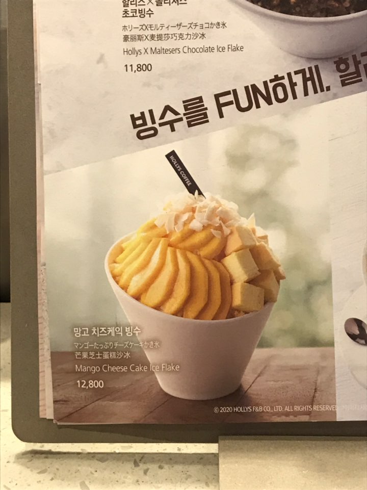 가격은 망고치즈케익 빙수를 제외하고 모두 11,800원이었구요, 망고치즈케익 빙수는 12,800원이었어요. 망고 특유의 상큼하고 달짝지근한 맛이 땡겨 저는 망고로 선택했답니다.