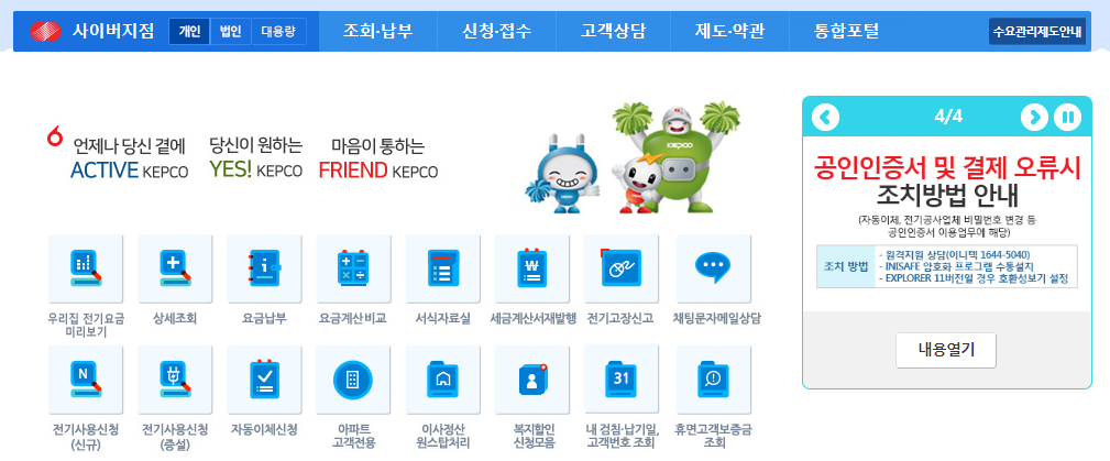 더불어서, 요금고지서를 인터넷이나 모바일, 카카오청구서로 수신할 경우 월 200원 할인이 됩니다. 사실 종이고지서가 오더라도 그걸 꼼꼼히 보는 경우가 많지 않고, 오히려 모바일 생활이 보편화된 요즘 모바일로 청구서를 받으면 원하는 아무때나 바로바로 확인할 수 있어서 더 편리하더라고요. 고객센터에 전화하거나(국번없이 123) 한국전력 사이버지점에서 신청할 수 있어요!