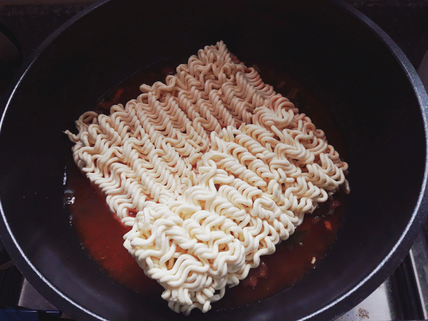 1. 냄비에 평소 라면 끓이는 물의 절반 정도만 붓고 끓입니다. 저는 250ml 사용.