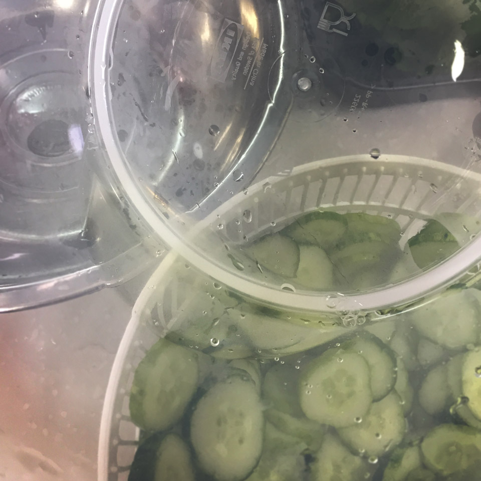 10분 후에 오이를 찬물에 헹구고 물기를 제거해주세요. 저는 여기서 신박한 아이템을 사용해서 물기를 제거해봤습니다. 이케아에 가니까 돌돌돌 돌리면 채소(야채) 물을 빼주는 도구가 있더라구요! 위에 있는 볼록 나온 손잡이를 돌리면 안에 체가 있어서 돌아가면서 탈수기같이 물을 제거해줍니다. 원래 상추 같은 거 씻어서 물기 빼주는 걸텐데 오이도 한번 해봤어요.