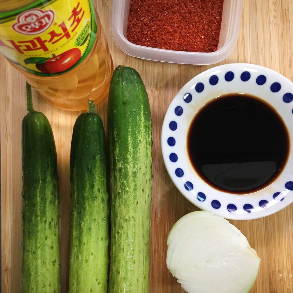 재료: 오이 2개(저는 3개로 했습니다.), 양파 0.5개, 소금 1큰술, 고추가루 2큰술, 설탕 1큰술, 매실액 1 큰술, 간장 2큰술, 다진마늘 0.5 큰술, 식초 2큰술, 깨 1큰술