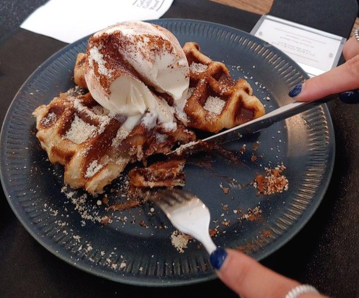 그리고 두조각...세조각...쉬지않고 움직이는 나이프와 포크..ㅎㅎ 크로플이 정말 딱 적당하게 구워져 겉은 바삭 속은 촉촉했어요. 그리고 무엇보다 생지속에 누텔라가 발라져 있어 고소하고 달달함이 더해졌어요. 누텔라가 또 너무 많으면 달아서 별로인데, 적당하게 들어가 있어 맛있더라구요.
