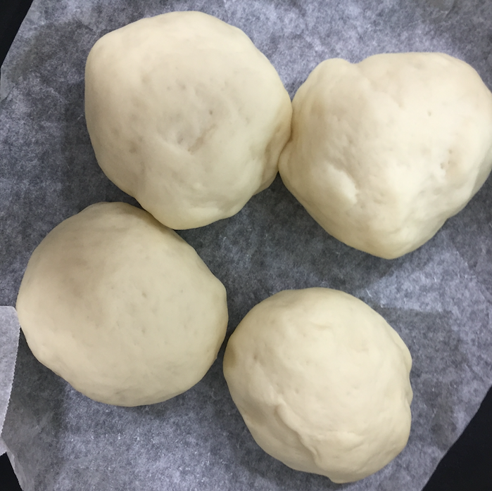 중간발효를 하면 좋다고 하는데요 저는 성형하면서 얼렁뚱땅 넘기고 2차발효만 했습니다. 한 20분 정도 해준 거 같아요. 부풀어서 서로 가까운 사이가 되었네요. 프라이팬에 구울 때 아래에 유산지를 깔고 불을 최대한 약하게 하는 것이 좋습니다. 불을 약하게 해서 20분 정도 굽고 다시 뒤집어서 10분 정도 더 구울 거예요. 오븐에 구울 때는 170도 정도에서 30분정도 구워주면 됩니다.
