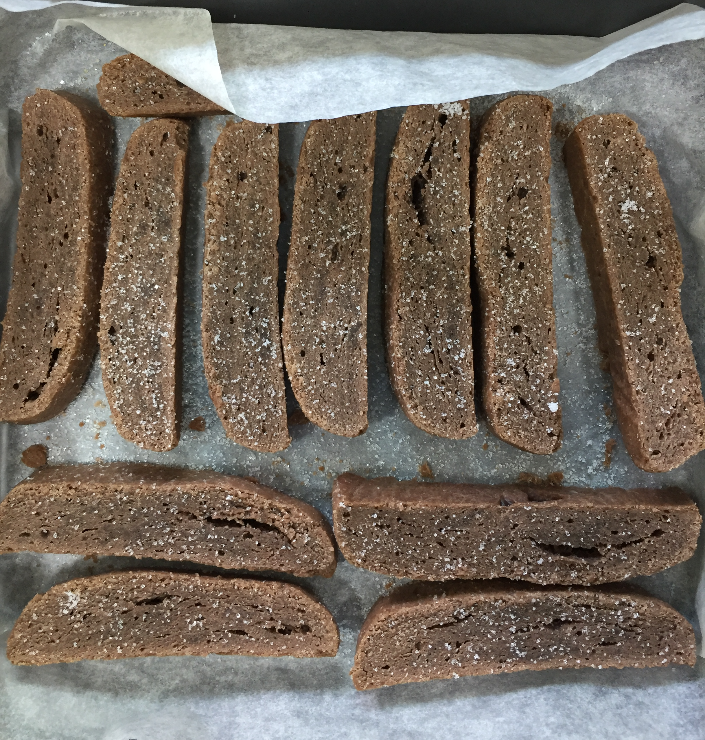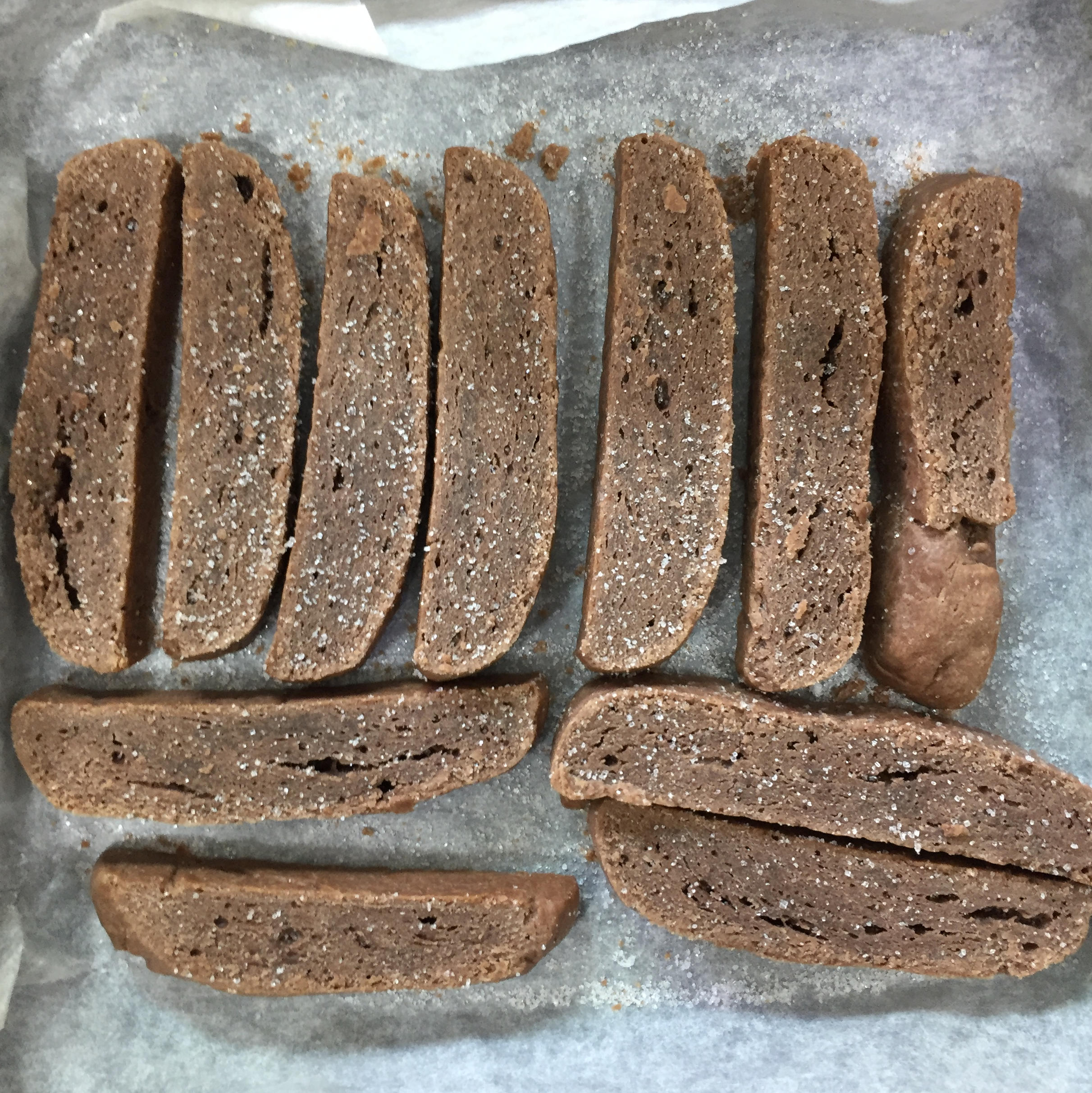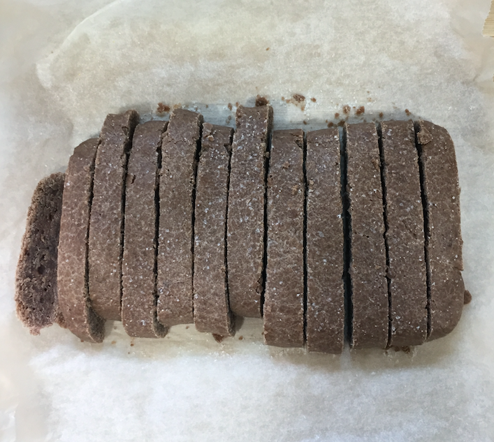 이것저것 다 빼고나니 재료도 별로 없네요.^^ 핫초코가루도 처음엔 넣을 생각이 없었는데, 우유도 빼고, 버터도 뺐기 때문에 향을 좀 내줄 재료는 있어야겠다 싶어서 넣어봤습니다. 핫초코 가루를 넣지 않았다면 견과류를 넣었을 거예요. 비스코티 쿠키는 한번 오븐에 구운 다음 슬라이스 해서 앞뒤로 한번씩 더 구워서 바삭한 식감이 들게 하는 거잖아요. 그래서 시간은 조금 더 듭니다. 하지만 식빵 만드는 것보다 치댈 필요도 없어서 더 쉬워요.