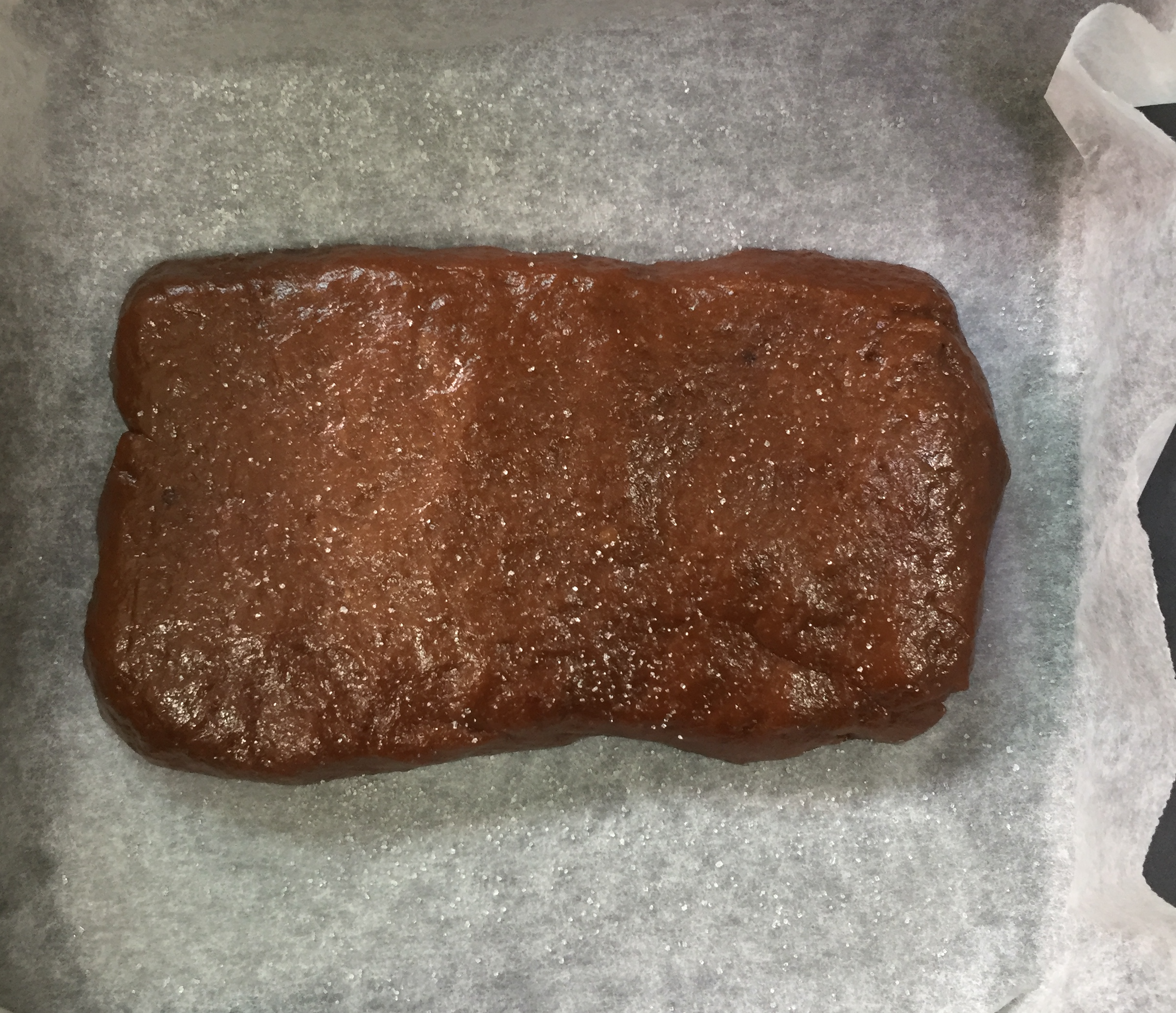 냉장고에서 1시간 숙성(?)된 반죽에 설탕을 뿌려줬어요. 여기서, 계란+식용유 섞을 때 미리 설탕을 섞으실 수도 있고 설탕을 나중에 뿌릴 수도 있을 거예요. 저는 핫초코 가루에 설탕이 들어 있어서 설탕을 같이 섞지 않았는데요. 좀 단맛이 나길 원하신다면 무조건 설탕을 같이 섞으시는 게 좋습니다. 나중에 뿌리는 것은 한계가 있거든요.