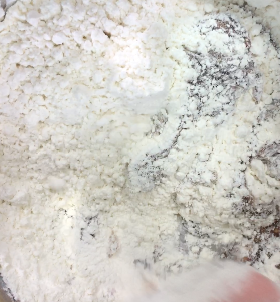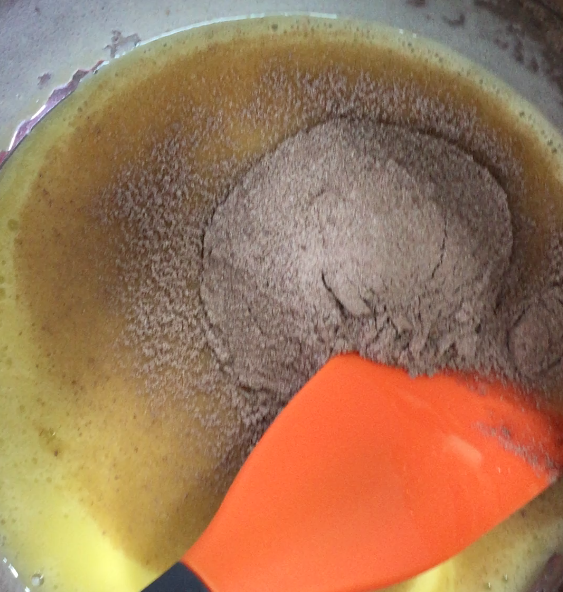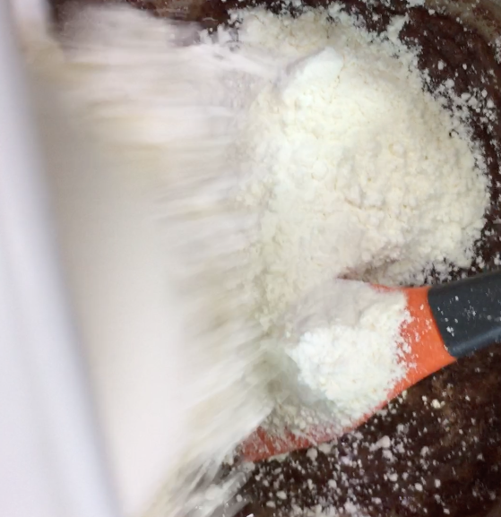 박력분을 준비했습니다. 과자류 케이크류처럼 부드럽고 단단하게 뭉치지 않는 걸 만들 때 쓰는 밀가루죠. 계란-식용유 섞은 것에 같이 넣어줍니다. 저는 코코아 가루를 먼저 넣고 섞어준다음 밀가루를 넣긴 했지만 밀가루, 코코아가루 한꺼번에 넣어도 상관 없을 것 같아요. 그리고 밀가루는 체에 쳐서 쓰는 게 좋지만 오늘은 쉽게 쉽게 하는 게 목적이니 없다고 가정하고 그대로 부어줬습니다.