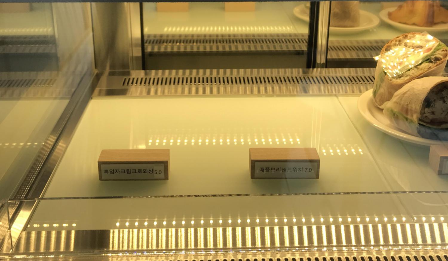 베이커런트에는 일반 빵 종류 외에도 샌드위치와 커피, 음료가 준비되어 있답니다. 샌드위치는 잠봉뵈르 외에도 애플브리 샌드위치와 에그 샌드위치가 있고, 크로와상 안에 흑임자 크림이 가득찬 흑임자 크림 크로와상도 주문하실 수 있어요. 아직 준비 전이라 쇼케이스가 비어있었지만 주문하면 만들어 주신다고 하셨어요.
