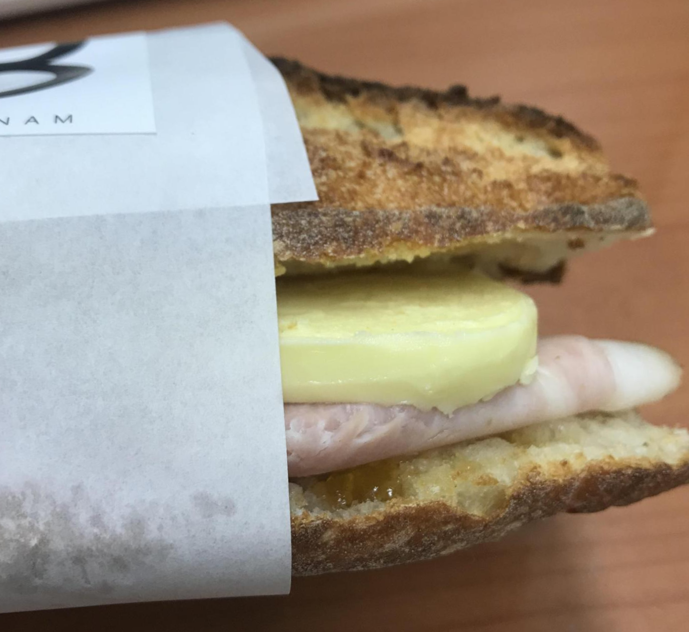 잠봉뵈르 안에는 햄과 버터가 들어간다고 했잖아요~두툼하게 썰은 버터 보이시죠? 햄도 넓게 저민 햄을 접어서 푸짐하게 넣어 주셨어요. 맛이 없을수가 없겠죠?