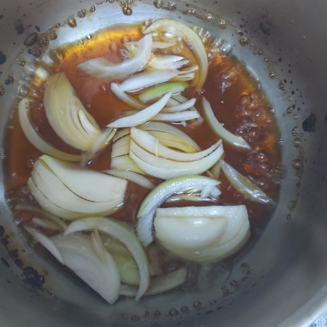 4. 소스가 끓어오를 때 양파를 먼저 넣어 좀 익혀줍니다.