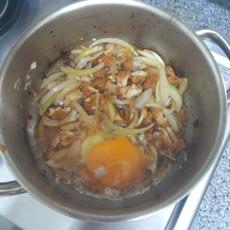 6. 양파가 어느 정도 익고 소스가 치킨에 베어들었으면 한쪽으로 미루어두고 계란을 톡 터뜨려줍니다.