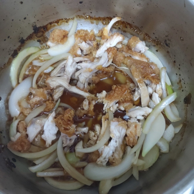 1. 우선 치킨 살을 작게 찢어서 준비해놓습니다.
