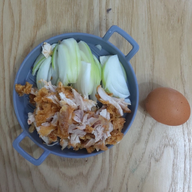 치킨을 시켜먹은 다음 날, 남은 치킨을 어떻게 할까 하다가 '백선생님이 남은 치킨을 그냥 두실 리가!' 싶어 찾아보니 역시나, 남은 치킨을 활용해 만드는 백종원 치킨마요덮밥 레시피가 있었어요. 남은 치킨은 에어프라이어에 돌리면 눅눅함이 사라지고 바삭해져 먹을만해지는게 고장이 난 상태라, 다른 방법을 찾아야했거든요~ 후라이팬에 종이호일을 깔고 구워도 나름 괜찮다고 하는데 집에 마침 종이호일도 똑 떨어졌네요. ㅠㅠ