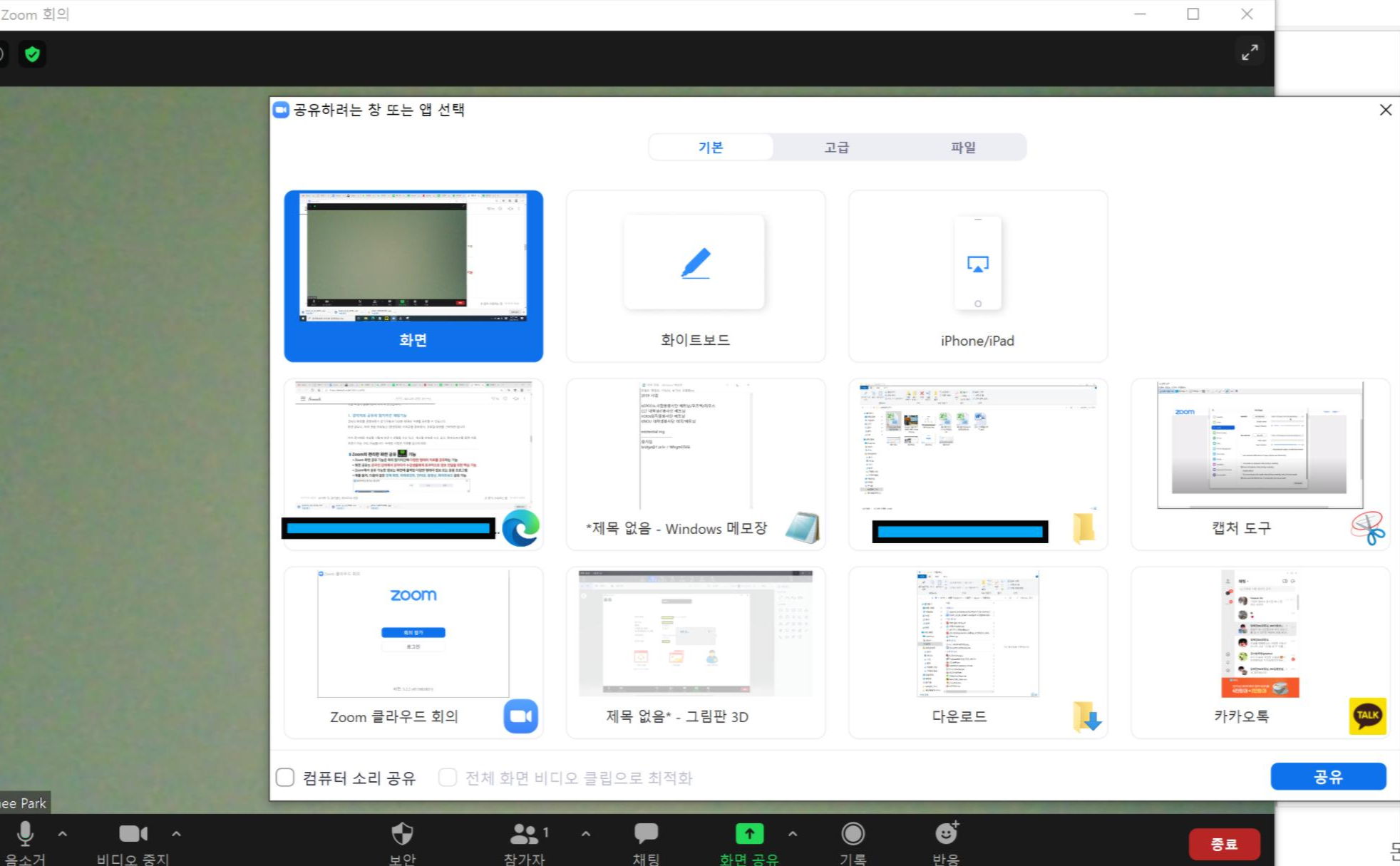 화면 및 오디오 설정을 개인 조절하고 회의를 시작하면 되어요.
