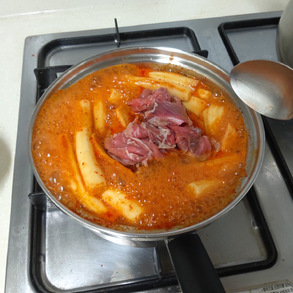 4. 밀떡도 끓어오르면서 익기 시작하면 차돌박이를 야심하게 풍덩~