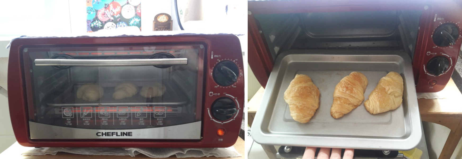자, 이제 발효된 크로와상생지를 굽굽할 시간!