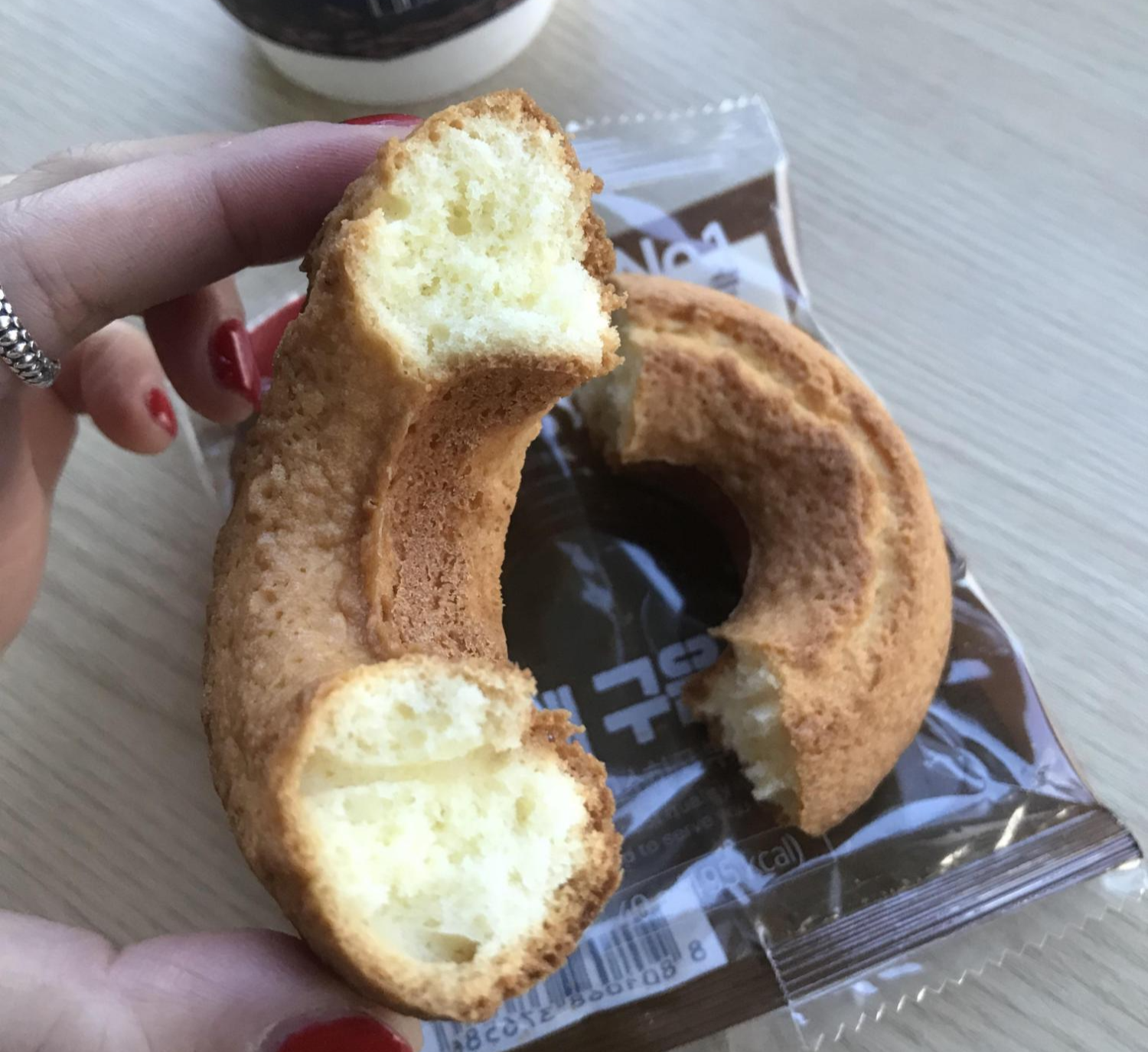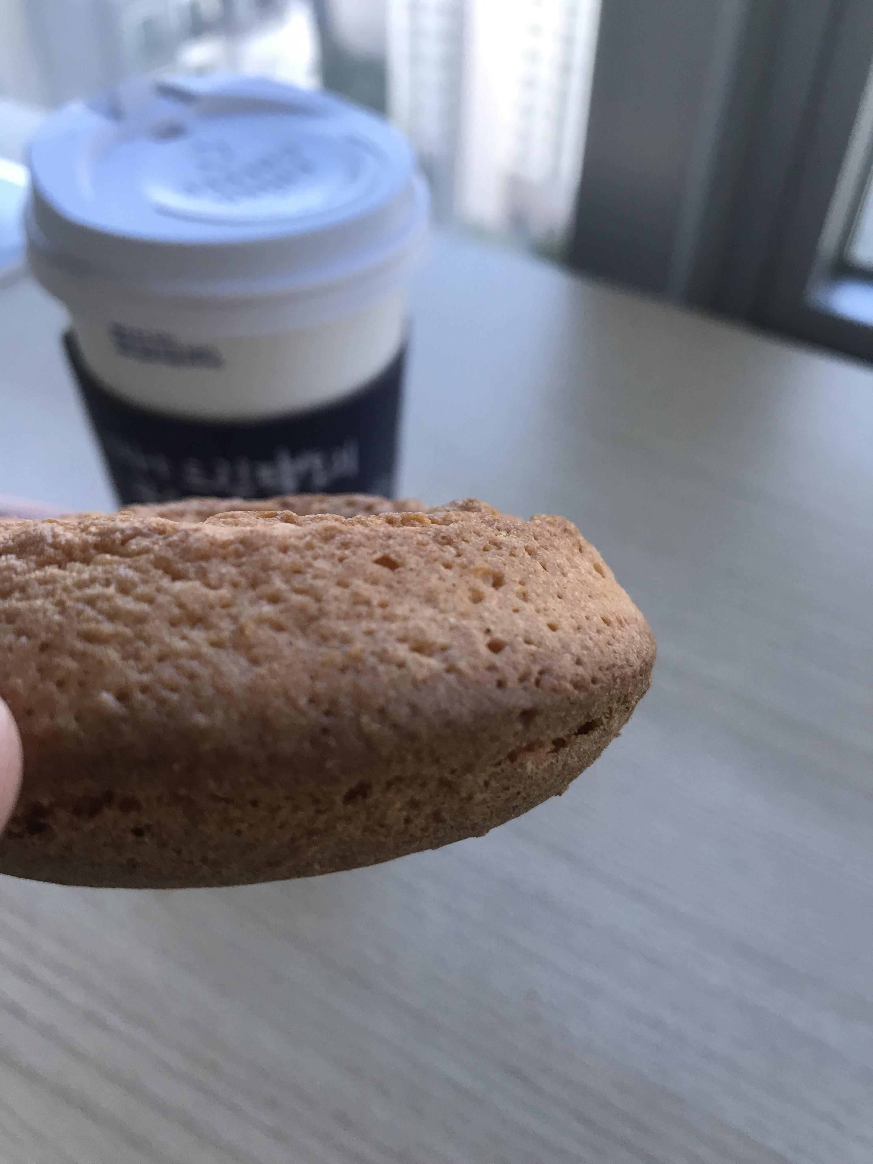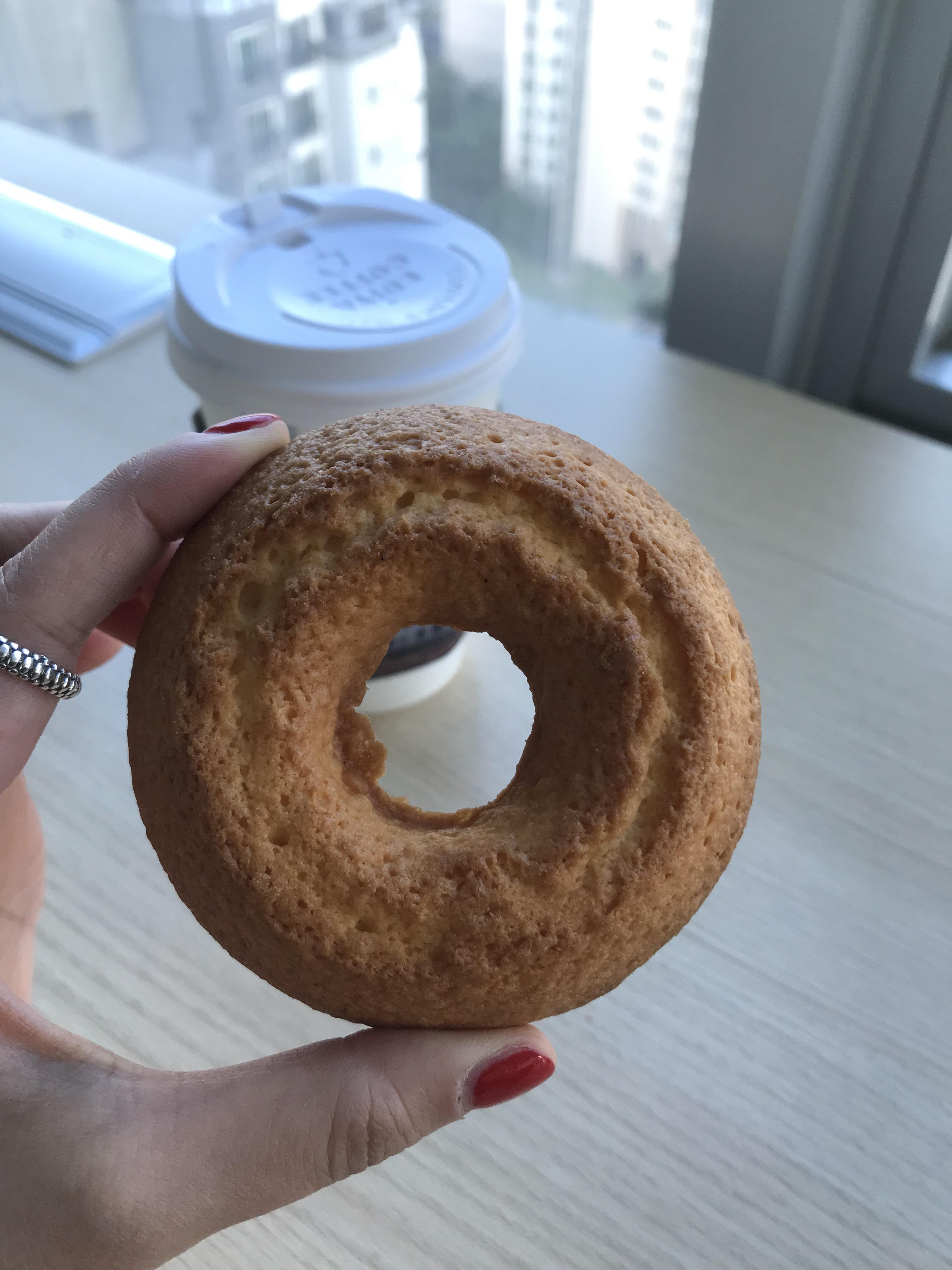 확실히 튀기지 않은 도넛이라 기름기가 덜하죠? 표면은 매끈하지 않고, 촉감 또한 말랑하지 않고 단단해요. 두께는 적당히 도톰해서 아침에 식사 대용으로도 든든하겠는데요?