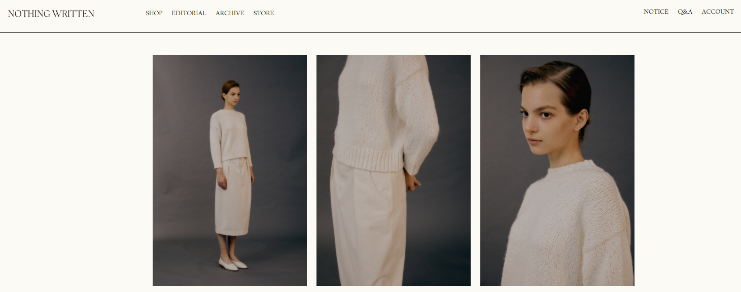 2017년도에 론칭한 디자이너 브랜드 낫띵리튼(Nothing Written). 홈페이지만 봐도 어떤 느낌인지 감이 오시죠? '옷자체의 개성 보다는 입는 사람의 고유감성이 뭍어나는 스타일을 추구'한다는 브랜드 아이덴티티로 20-30대 여성들에게 큰 사랑을 받고 있는 핫한 브랜드에요. 브랜드 컨셉처럼 심플하고 차분한 인테리어의 쇼룸에서는 핏팅도 가능하답니다. 시즌에 따라 남성복을 준비하기도 하는데요, 관심있는 남성분들은 인스타 팔로우를 해두시면 알림을 받으실 수 있습니다. 쇼룸 위치는 한강진역에서 도보로 약 5분정도로, 일정 전후로 둘러보시기 좋겠네요.