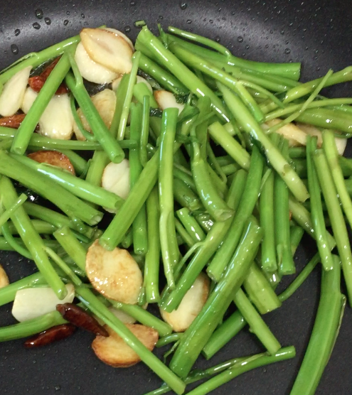 마늘이 색이 나면 공심채 줄기부분만 먼저 넣고 같이 볶아요. 잎이 있는 얇은 부분은 금방 무르기 때문에 줄기부분만 먼저 볶습니다. 공심채가 그렇게 억센 채소는 아니지만 그래도 억센기운이 줄어들면 나머지 부분도 같이 넣고 빨리 볶아줍니다.