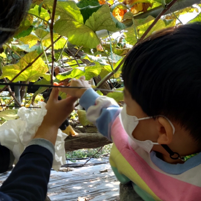 사실 캠벨포도 12송이 + 샤인머스켓 2kg 따는 게 얼마나 오래 걸리겠어요? 금방 다 딸 수 있는데요,^^ 따는 양이나 시간보다는 직접 따는 경험 그 자체, 그리고 포도나무가 빽빽하게 들어선 포도밭에 선 시각적, 물리적 경험, 내가 직접 딴 포도를 가족과 함께 나누어 먹는 경험.. 그런 것들이 아이들에겐 의미있는 경험이고 신나는 놀이고 그랬던 것 같아요.