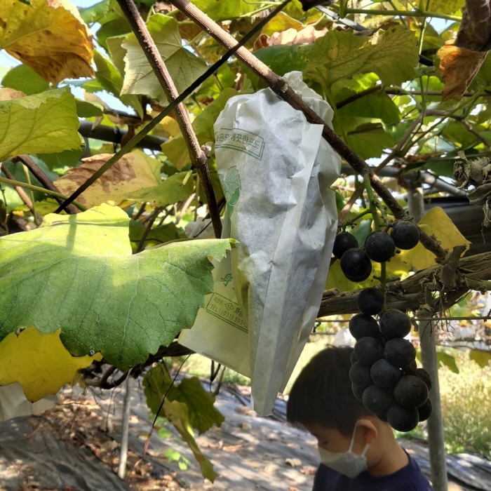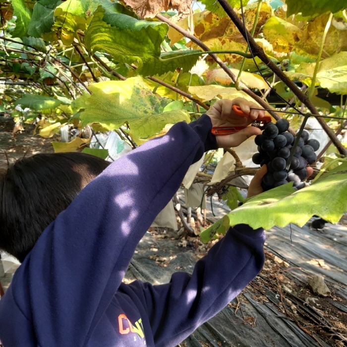 준비해간 김밥, 샌드위치, 컵라면, 음료수 등을 먼저 먹고, 아이들이 "포도 딸래요" 해서 농장 사장님께 말씀을 드렸더니 바로 옆에 있는 하우스로 데려가셨어요. 비닐봉투(친환경 분해 비닐봉투를 사용하시는 센스에도 감탄했습니다. ㅎㅎ)를 각각 아이들에게 나누어주시고, 한 명씩, 한 송이 씩 포도를 딸 수 있게 도와주셨어요. 종이봉투에 포도가 감싸져 있어서 겉으로는 포도 상태가 어떤지 알기가 어려운데 가급적 좋은 상태의 포도를 골라 주셨고요. 가위로 포도 가지 윗부분을 싹뚝 잘라야 하는 거라 혹여나 아이들이 손을 다치지 않게 잘 설명해주시고 도와주셨습니다.