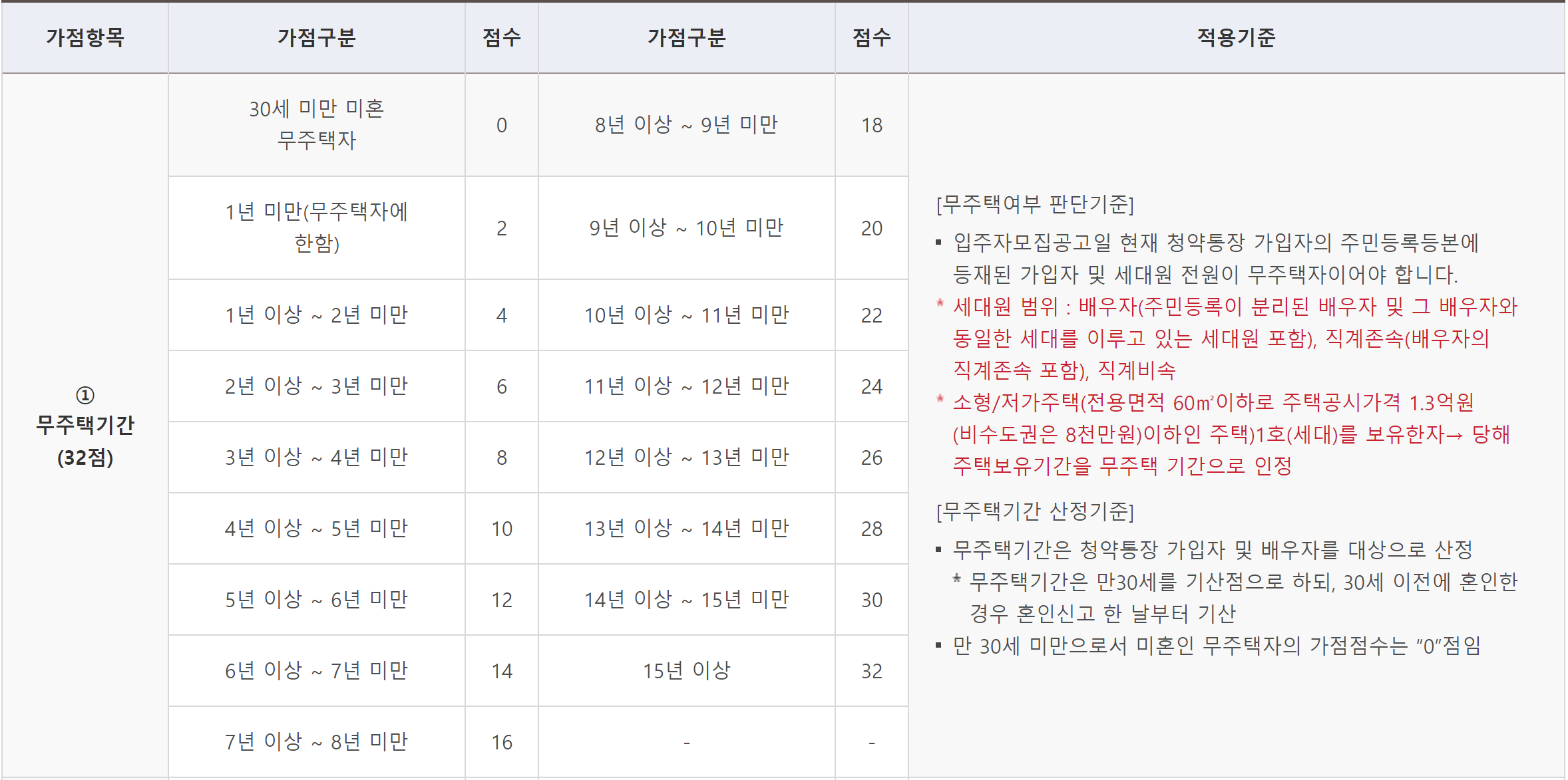 위의 기본 기준을 충족했다면, '무주택기간/부양가족수/청약통장가입기간'을 기준으로 가산점이 산정되고, 이를 통해 당첨자가 선정되는데요. 청약가점 산정 기준표는 아래와 같습니다.