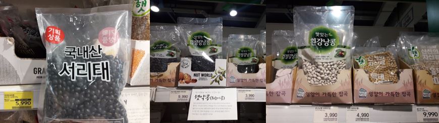 다양한 콩들 앞에서 멈칫.. 당황했다가 그냥 눈에 익숙한 국산 서리태 검정콩을 집어왔는데요.