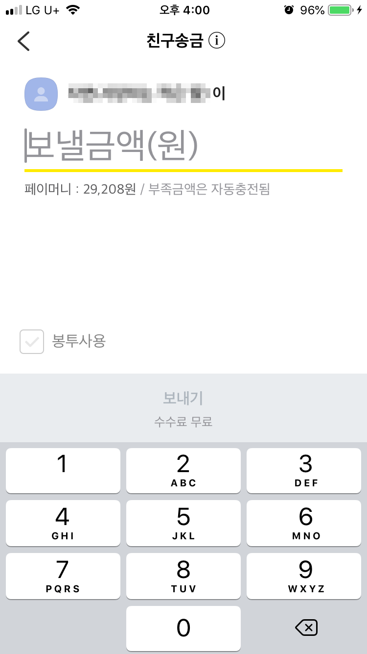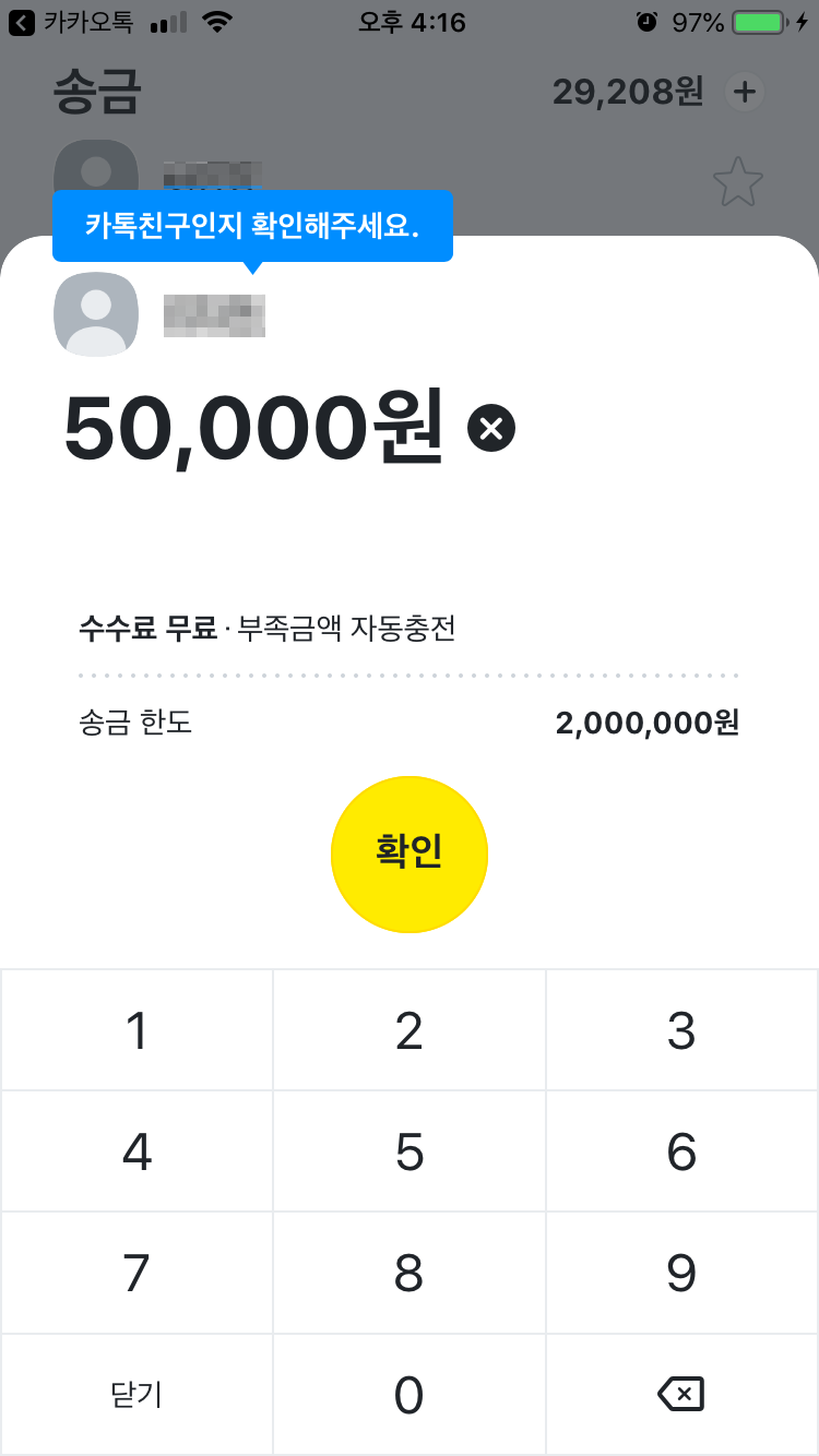 이렇게 보낼 대상을 선택하면 송금 확인 팝업이 카카오톡 창에 나타납니다. 보낼 금액을 입력하고 확인을 누르면 송금이 되는데요. 금액이 부족하면 연결된 계좌에서 즉시 충전되고 송금됩니다.