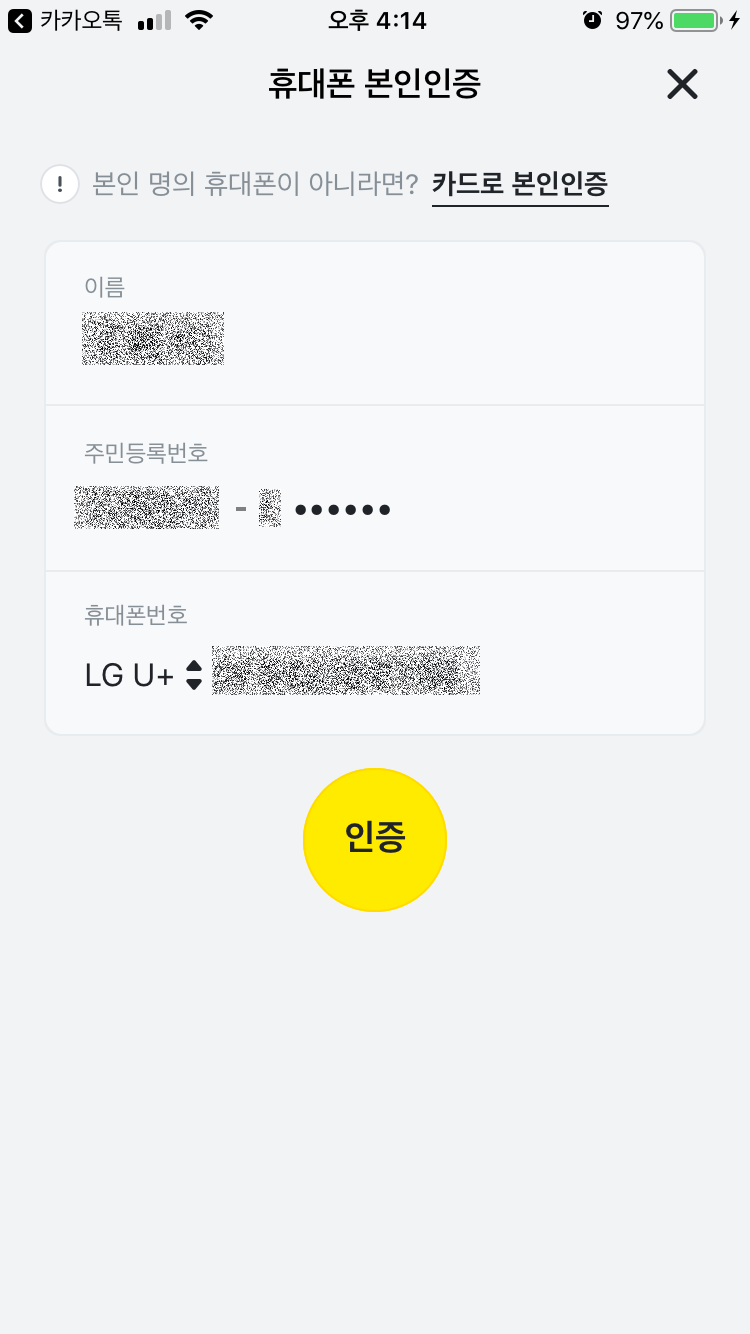 카카오페이 전용 앱이 있습니다. 처음설치를 하면 인증을 거칩니다. 편하게 카카오 톡으로 인증을 하고나면 아래 오른쪽 화면이 나옵니다.
