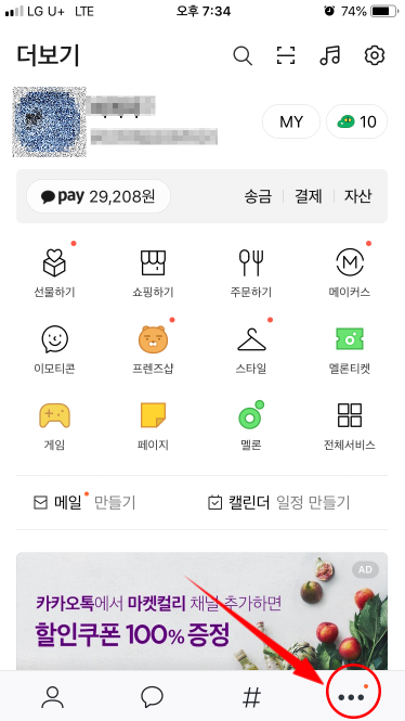 카카오페이 앱을 설치하지 않아도 카카오 페이를 카카오톡에서 이용할 수 있거든요. 저도 카카오페이앱을 설치하기 전 최근까지는 계속 이 방법을 쓰고 있었습니다. 카카오톡에서 카카오페이로 들어가려면 카카오톡 아래쪽에 있는 4개의 버튼중 오른쪽 ooo 모양 버튼을 누르면 아래와 같은 페이지로 이동하게 됩니다. 이름 밑에 pay가 보이고 송금 결제 자산 이란 메뉴도 보이죠. 맨위에는 돋보기 모양 옆에 [-] 모양의 아이콘도 있습니다.