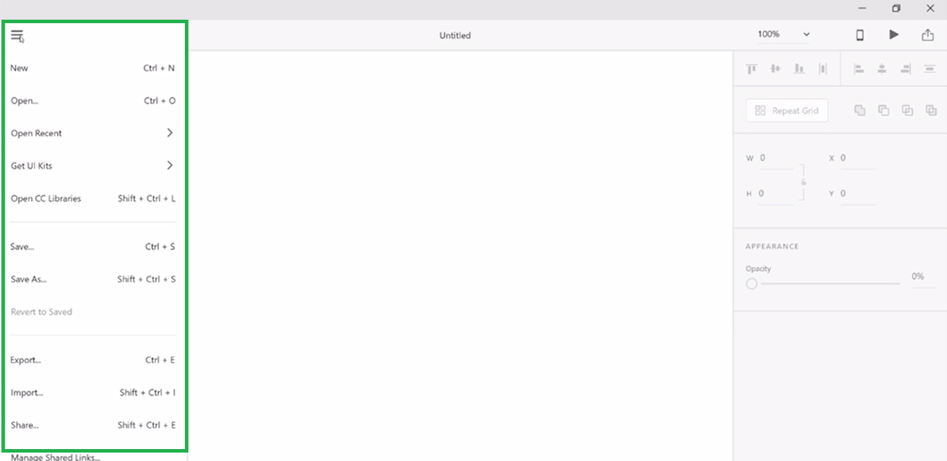 어도비XD 메뉴는, 윈도우즈의 경우 왼쪽상단 햄버거(삼선)버튼을 누르고, 맥의 경우 화면상단의 메뉴막대를 이용합니다.