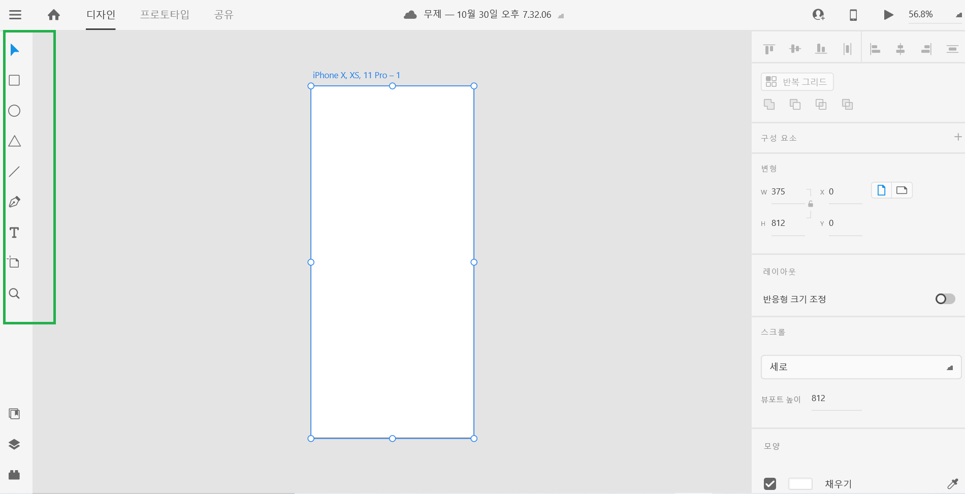 어도비XD는 두가지 모드를 제공하는데 '디자인'과 '프로토타입'입니다.