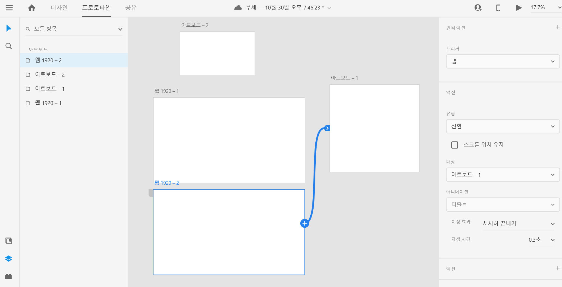 프로토타입 모드에서는 화면 간의 인터랙션을 연결할 수 있습니다. 한 아트보드에서 파란색 점을 잡아당겨 다른 아트보드로 끌고 연결할 수 있어요.