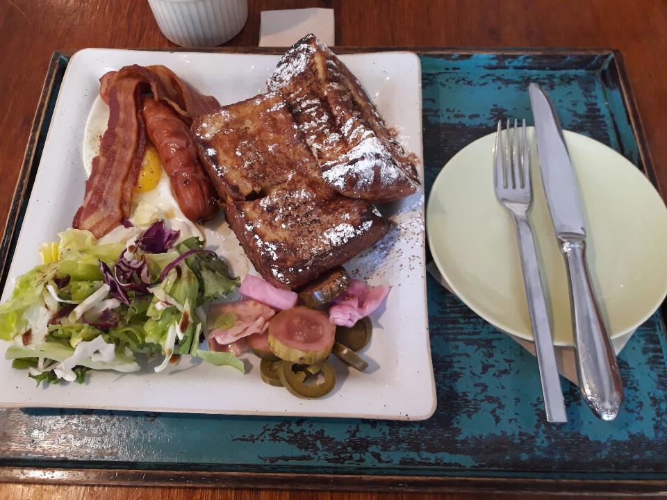 짠~ 연희동카페 뱅센느의 '패리스~ 브런치' 세트! 시나몬향이 가득한 촉촉한 빵, 베이컨, 소세지, 계란, 피클까지 알차게 담겨 나왔어요. 여기엔 커피 한잔도 포함되어있어요.