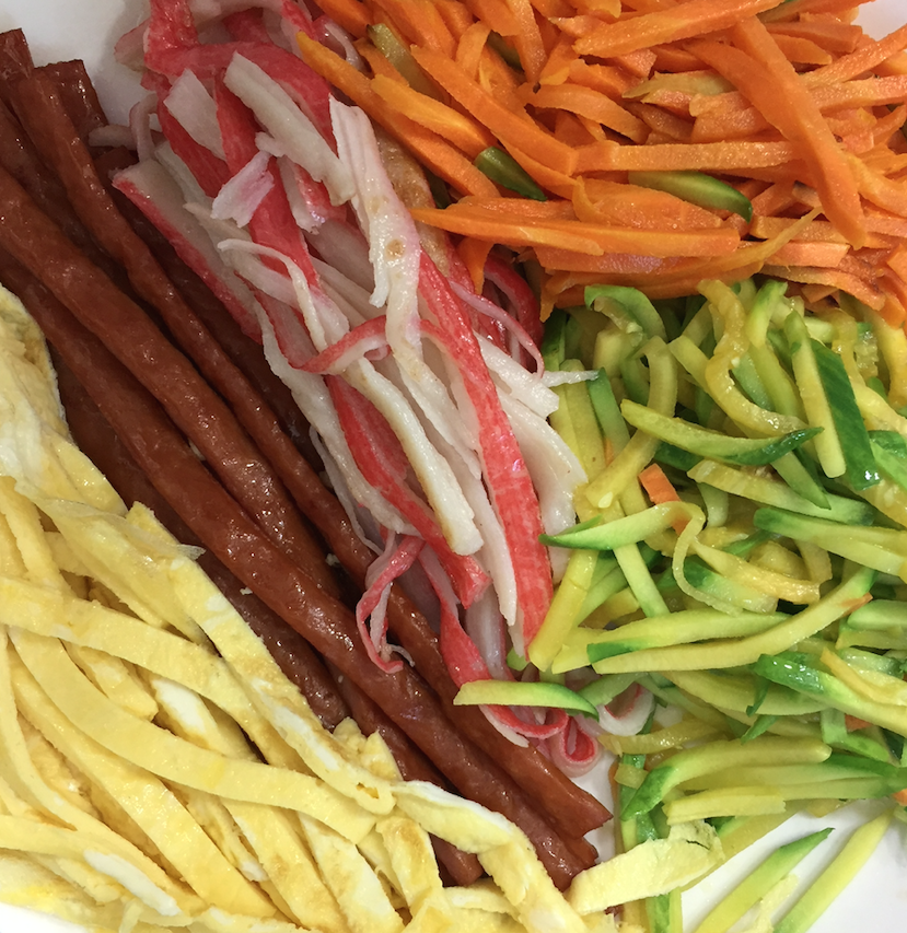 계란은 채를 썰었어요. 채를 썰면 계란 3개정도로 되구요. 채를 썰지 않고 도톰한 것을 원하시면 계란 6개 정도는 있어야 됩니다. 계란까지 채썰어서 이제 재료는 모두 준비가 되었습니다.