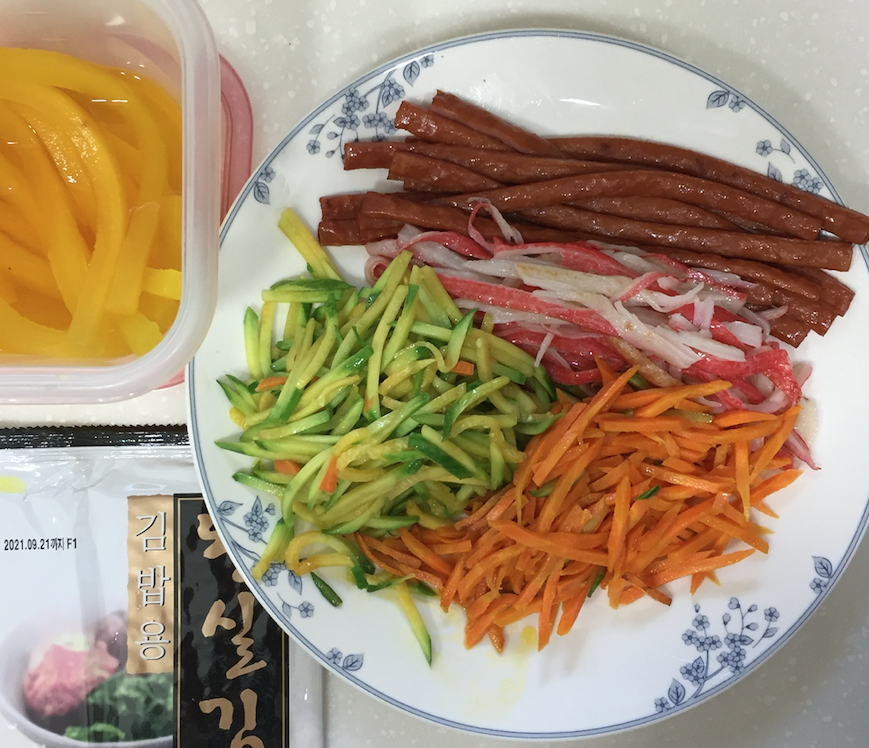 김밥 재료 키트에 들어 있는 햄은 길게 썰고 게맛살은 찢어서 준비했어요. 게맛살은 바로 찟으면 길게 찢어지지 않는데요, 살짝 볶아주면 좀 더 탄력이 생겨서 길게 찢어지더라구요. 단무지는 그대로 물기만 제거하고 넣을 거니까 따로 손질하지 않았습니다. 당근과 호박은 볶아놨어요. 당근과 호박은 오래 볶지 않았어요. 살짝 살캉한 느낌이 들도록 해서 오늘 전반적으로 재료들이 씹는 맛이 나면 좋겠다 생각했습니다.
