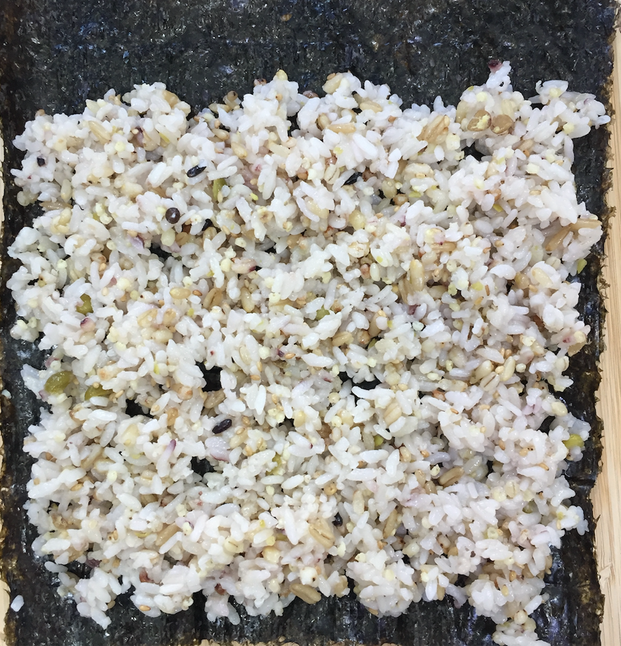 이제 김밥을 본격적으로 싸줍니다. 밥을 먼저 깔아주는데요 가능하면 얇게 깔아주는게 맛은 좋은데 든든한 한끼를 원하시면 밥을 사알짝 두껍게 깔면 밥이 많이 들어간 왕김밥이 나옵니다. ㅎㅎ 그리고 한 3-5센티미터 정도 남겨주고 밥을 깔아주세요. 끝까지 채워도 되지만 그럴 경우는 밥을 정말 얇게 깔아야하더라구요. 남겨둬야 마지막 부분이 두껍지 않아서 좀 더 잘 붙습니다. 저는 잡곡이라 밥이 두껍게 깔렸는데요. 최대한 얇게 깔아주는 주면 좋아요. 물론 이것도 취향이지만.^^