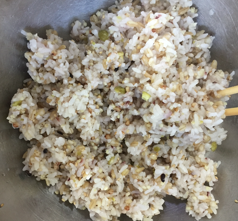 밥은 앞서 말씀드린 것처럼 잡곡밥을 준비했어요. 우선 2인분 분량만 싸려고 하구요. 금방 해놓은 밥을 퍼 놓은 것인데 여기에 식초와 소금 간을 살짝 해줬습니다. 식초는 취향이긴 하지만 살짝 섞어야 맛이 좋던데요. 안하시는 분도 많더라구요. 밥 2주걱 정도에 식초 1큰술 정도 넣었습니다. 설탕 조금 섞는 분도 계시구요. 그럴 때는 식초물을 따로 만들어서 섞는 것이 좋겠죠. 그리고 소금간 살짝 했습니다. 재료에 김치처럼 짠 것이 많이 들어가는 경우나 김밥 재료에 간이 적은 경우는 조금 더 소금간을 해주면 좋을 것 같아요.