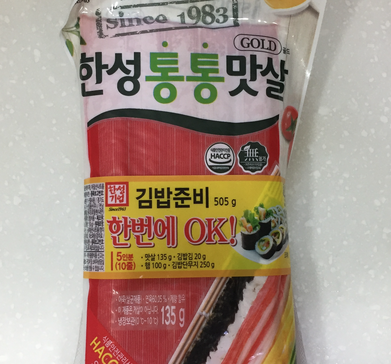 김밥재료는 본인이 좋아하는 재료를 넣는 것이 기본이죠. 꼭 단무지를 넣어야하는 것도 아니고 당근이나 시금치가 꼭 있어야 하는 것은 아니니까요. 마트에서 한성에서 나온 김밥 준비 한번에 OK라는 걸 사왔어요. 예전엔 여기에 당근 볶은 것이나 우엉 같은 것도 들어 있던 것 같은데 요즘은 가격 때문인지 그런 건 빠져 있고 김(10장), 게맛살, 단무지, 김밥용 햄 이렇게 단촐하게 들어 있더라구요.