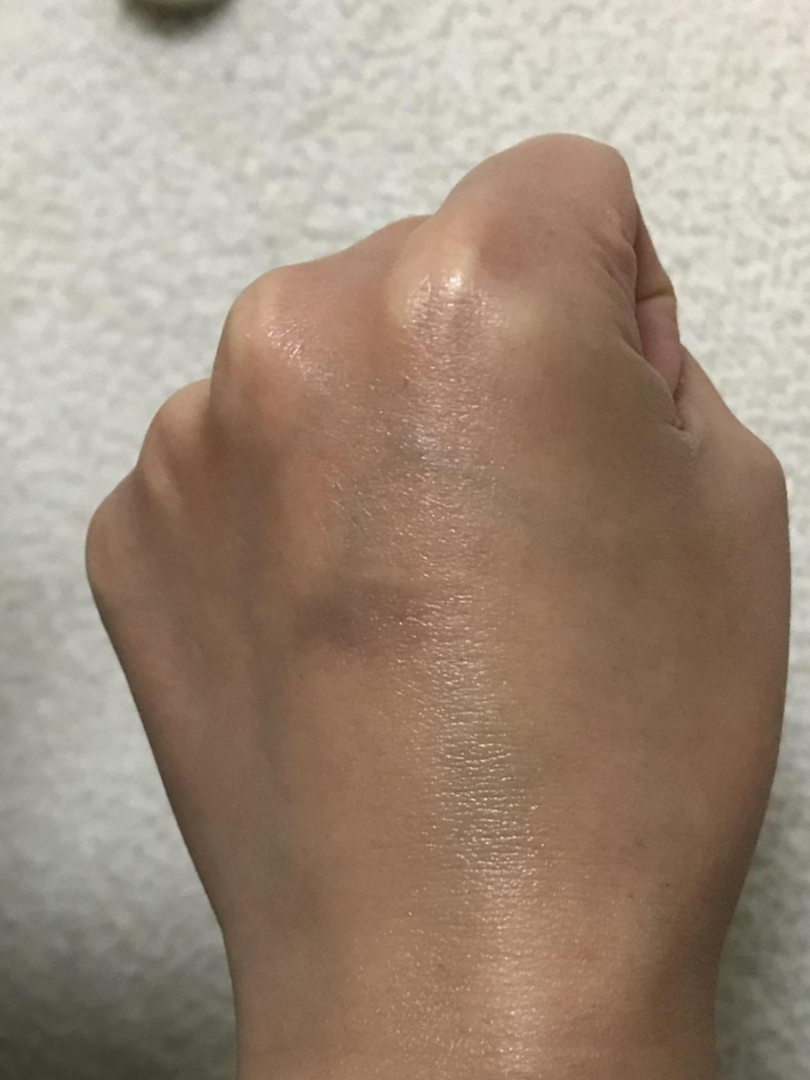 그리고 아래사진은 약 1분 후 다시 손등을 촬영해 본 사진이에요. 별도의 터치나 추가로 미스트를 더 분사하지 않은 상태인데도, 촉촉함이 남아 있죠? 일반 워터형 미스트나 타 사 제품을 사용했을때는 미스트를 뿌리고 어느정도 시간이 지나면 더욱 건조해짐이 느껴졌는데, 확실히 유분(크림)이 적절히 배합되어 있어 시간이 지나도 쫀쫀 촉촉 하네요.