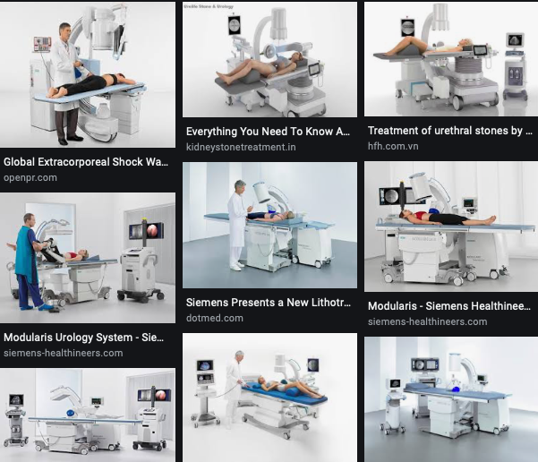 요로결석이 어디에 생겼는지에 따라 약물 치료만으로 가능하거나 수술을 해야하는 경우도 있는데요. "체외충격파 쇄석술"이 치료방법으로 많이 사용되나 봅니다. 저는 정형외과에서 손에 들고 하는 체외충격파만 경험해봤는데요. 신장이나 요관에 있는 결석을 쇄석(깨뜨리거나 금이가게 만드는)하는 장비는 수술대위에 누워서 거대한 현미경 같은 것으로 빛을 쪼일 것 처럼 생겼습니다.