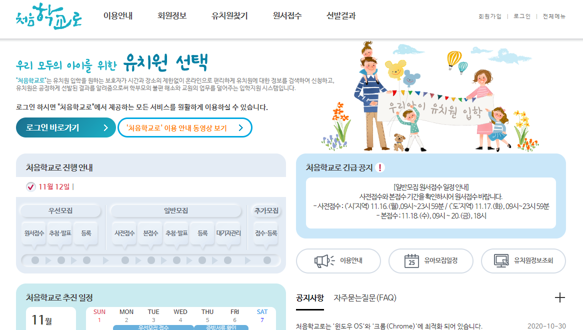 처음학교로는 유치원 입학을 원하는 보호자가 시간과 장소의 제한없이 온라인으로 유치원에 대한 정보를 검색하여 신청하고, 유치원은 공정하게 선발된 결과를 알려줌으로써 학부모의 편리는 높이고 교원의 업무는 경감하기 위한 시스템이라고 해요.