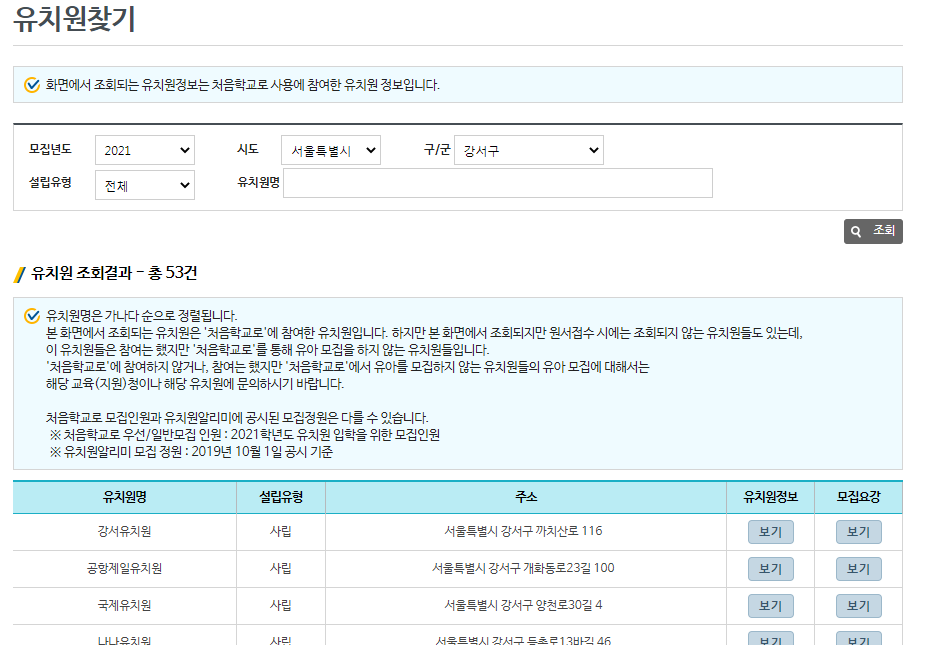 제가 2021년도 서울특별시 강서구 유치원을 검색해봤어요. 이렇게 가나다순으로 유치원명이 나열되고요, 유치원정보와 모집요강을 각각 확인할 수 있는 버튼이 활성화됩니다.