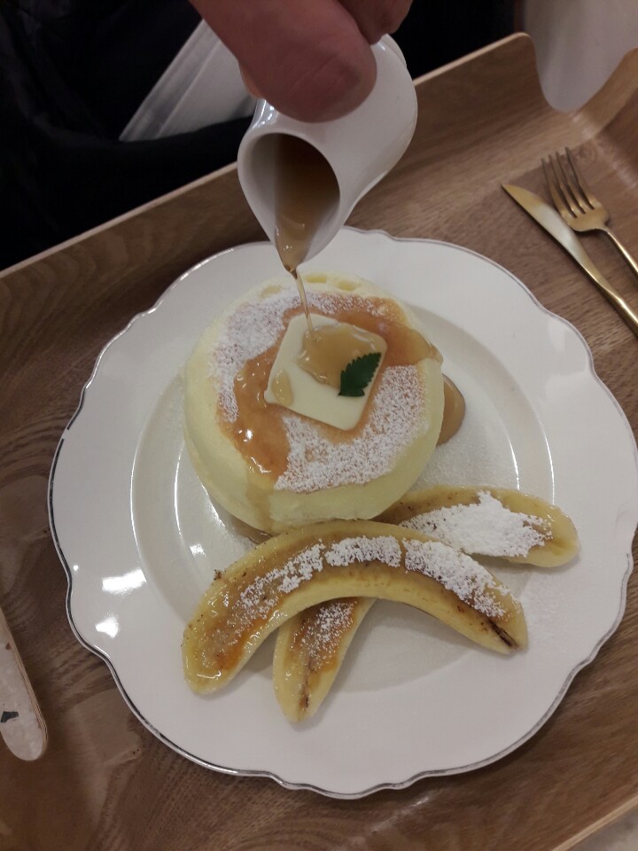 시럽을 쪼로록 부어주고, 폭신폭신 수플레를 조심스럽게 떠먹어줍니다..☆ 부드럽고 촉촉!